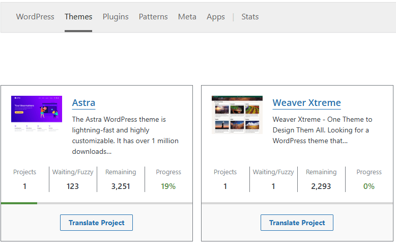 Como se puede observar le ofrece a uno realizar traducciones generales de WordPress, temas, Plugins, Patrones y demás, hay bastantes cosas pendientes por traduccir por lo que hay bastantes opciones para contribuir en el área.