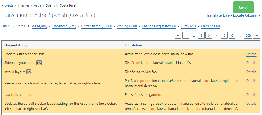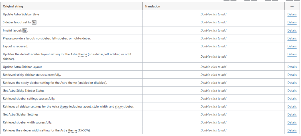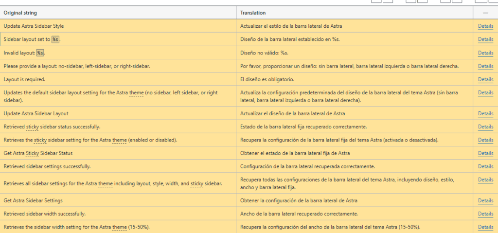 En estas traducciones mantuve coherencia con la terminología usada anteriormente, especialmente con “barra lateral” para “sidebar” y “diseño” para “layout”, que son términos ya bastante estandarizados en WordPress en español latinoamericano. Decidí traducir opciones como “no-sidebar”, “left-sidebar” y “right-sidebar” a sus equivalentes en español para que sean más comprensibles para el usuario final, en lugar de dejarlas en inglés. Además, cuidé que los mensajes de error fueran claros y directos, como “Diseño no válido” y “El diseño es obligatorio”, siguiendo el estilo habitual de WordPress. También mantuve los placeholders como “%s” sin modificar, respetando su uso dinámico dentro del sistema.
