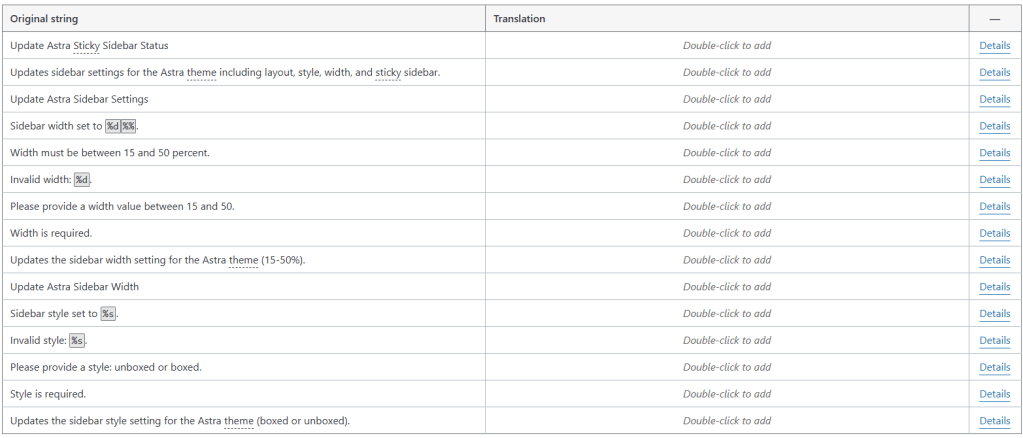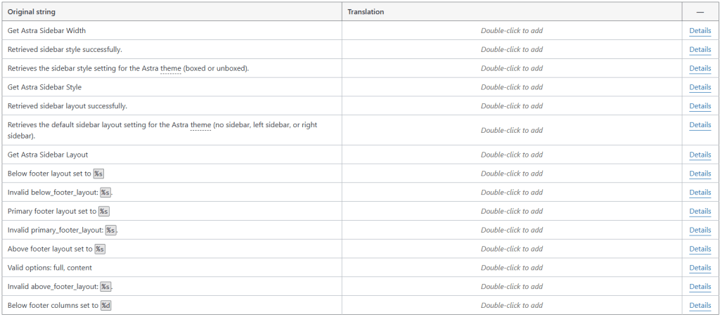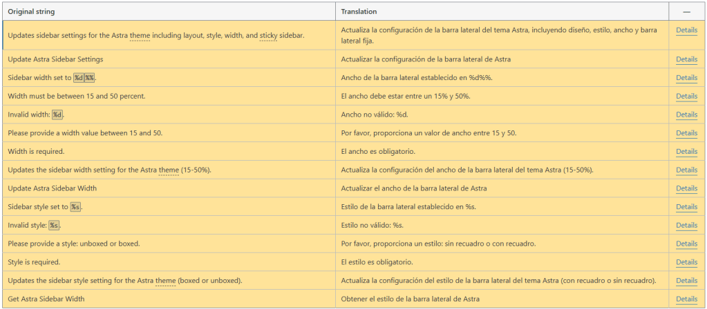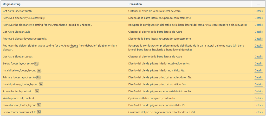 Además, mantuve los placeholders como “%s” y “%d” sin cambios, respetando su función dinámica dentro del sistema. En las secciones del footer, opté por traducir “above”, “primary” y “below” como “superior”, “principal” e “inferior”, asegurando coherencia con traducciones anteriores del header.