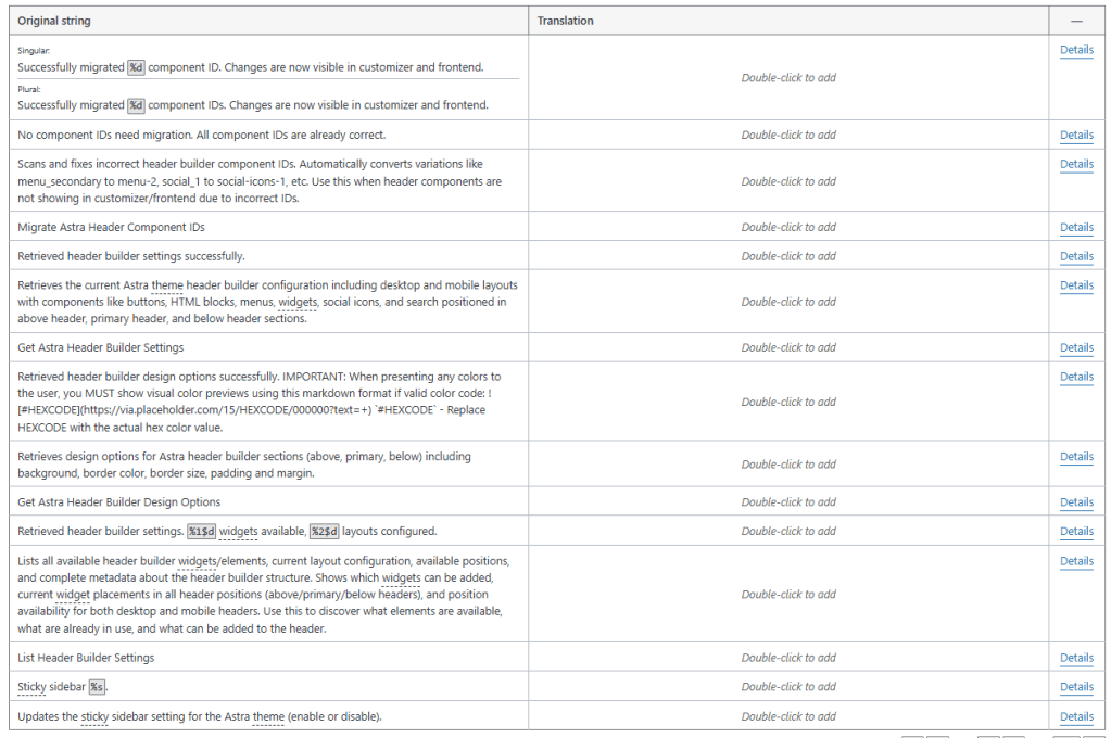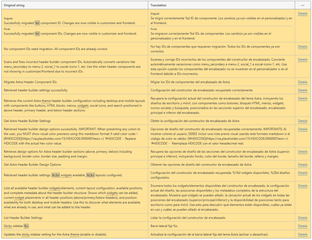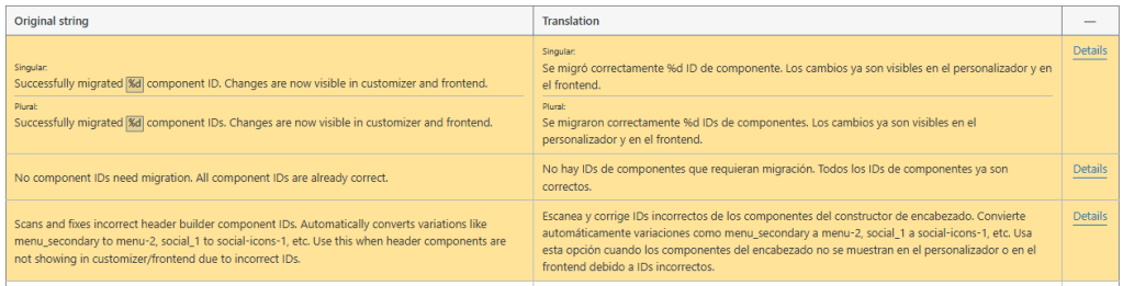 Para estas traducciones mantuve un enfoque técnico y consistente con la terminología utilizada en WordPress, especialmente en elementos como “IDs de componentes”, “personalizador” y “frontend”, que son términos comunes en el ecosistema. Opté por usar estructuras claras y naturales en español latinoamericano, evitando traducciones literales que pudieran sonar forzadas. También cuidé la coherencia en singular y plural, respetando el uso de “%d” y asegurando concordancia gramatical. En la descripción, prioricé la claridad explicativa, manteniendo ejemplos como “menu_secondary” sin traducir, ya que son identificadores técnicos, pero adaptando el resto del texto para que sea comprensible para usuarios finales y desarrolladores.